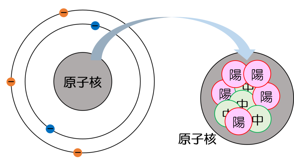 また、原子核構成する陽子と中性子を総称して核子と呼ばれます。