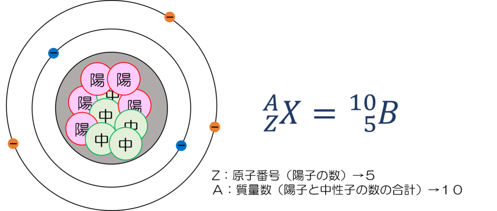 図3の例では、陽子が5個、中性子が5個のため質量数10、原子番号5のホウ素(B)であることが分かります。