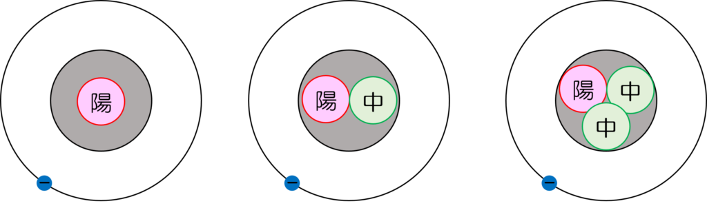 水素(左)、二重水素(中央)、三重水素(右)を表している。