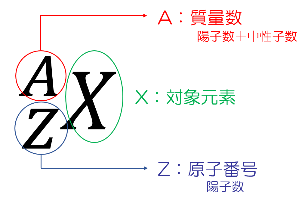 元素の種類は原子番号(原子核内の陽子の数)のみによって決定され、核種は原子番号と質量数(原子核内の陽子と中性子の数の合計)によって決定されます。