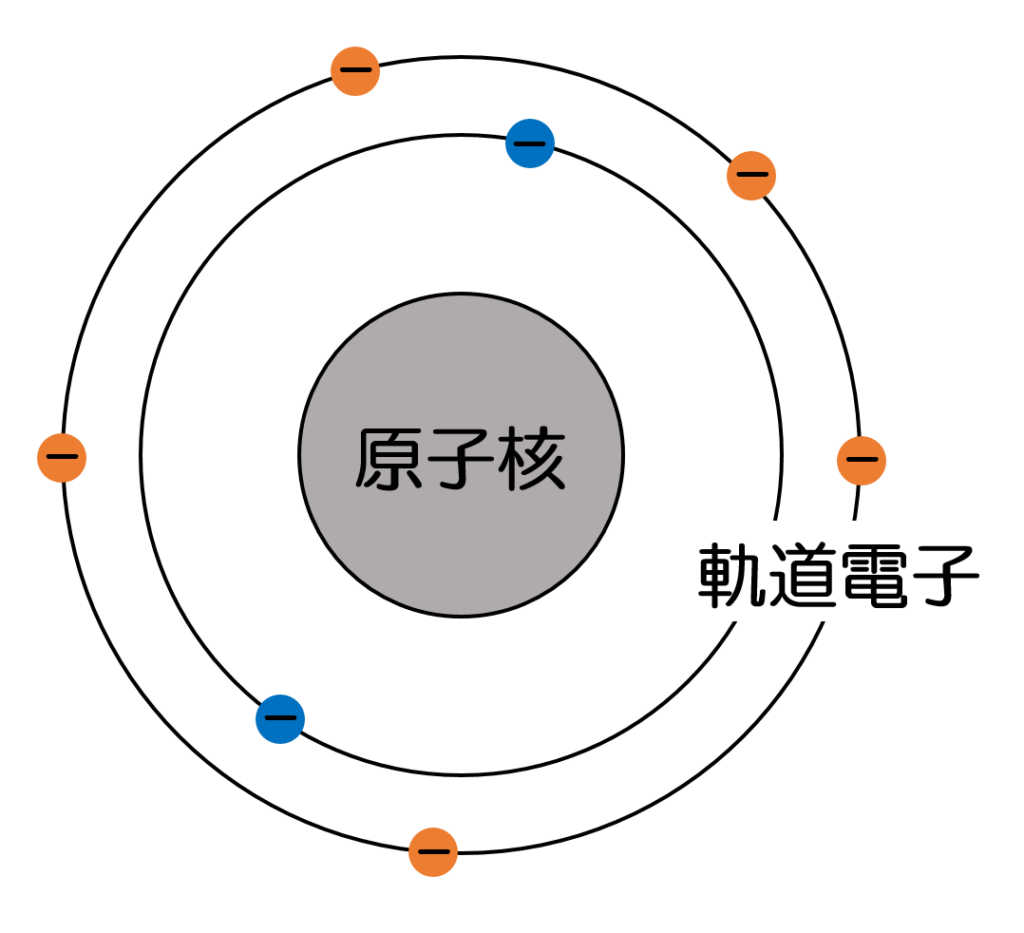 - 原子核はプラス、軌道電子はマイナスの電荷をもちます。